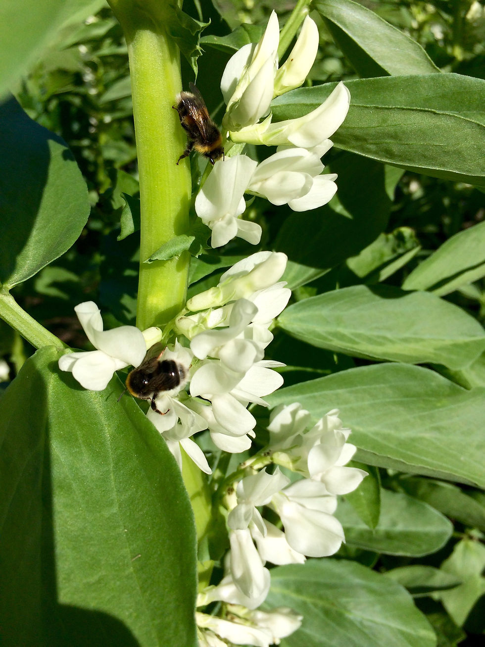 Not only I but also the bumblebees love our broad beans! They have lovely large white flowers and at any one time they are covered with all sorts of bees.